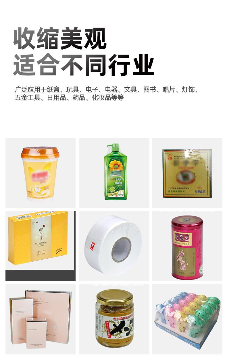 POF收缩机被广泛应用于纸盒、玩具、电子、电器、文具、图书、书籍、书本、画册、相框、相册、小黑板、唱片、洗发水、沐浴露、洗手液、五金工具、电线、日用品、饮料、纪念标签、透明胶带、医药盒、食品盒、化妆品盒、茶叶盒、手机盒、手机电池盒、移动电源盒、数据线盒、MP3/MP4纸盒、平板电脑盒、饭盒、盒饭、快餐盒、挂面、面条、桶面、盘纸、卷纸、蔬菜、口罩等商品的热收缩包装。