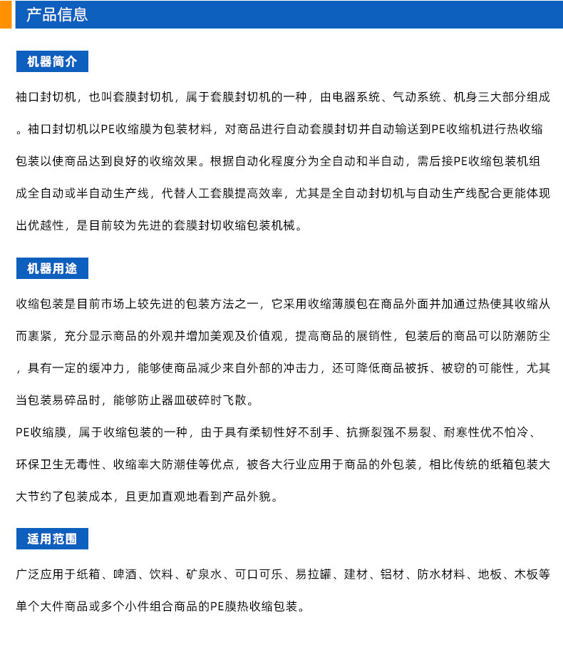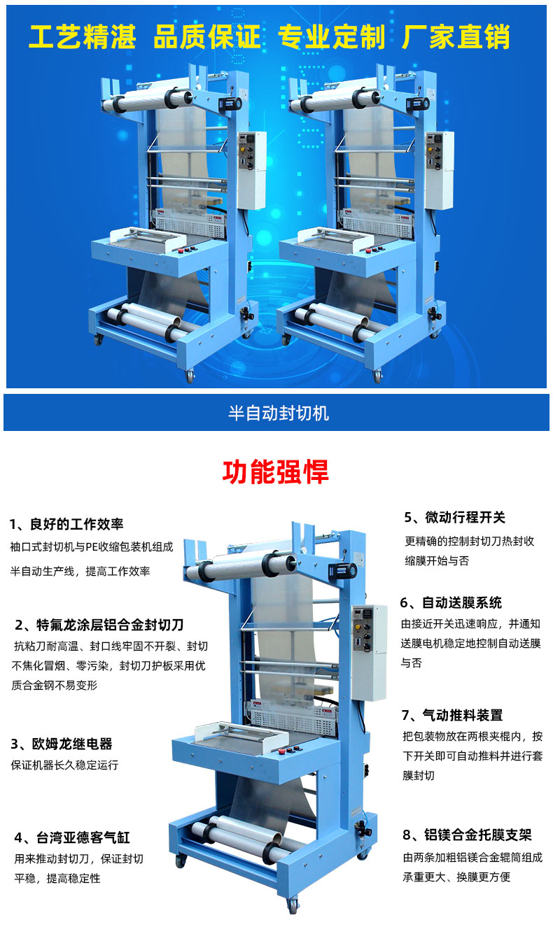 1、袖口式封切机与PE收缩包装机配套组成半自动生产线,提高工作效率