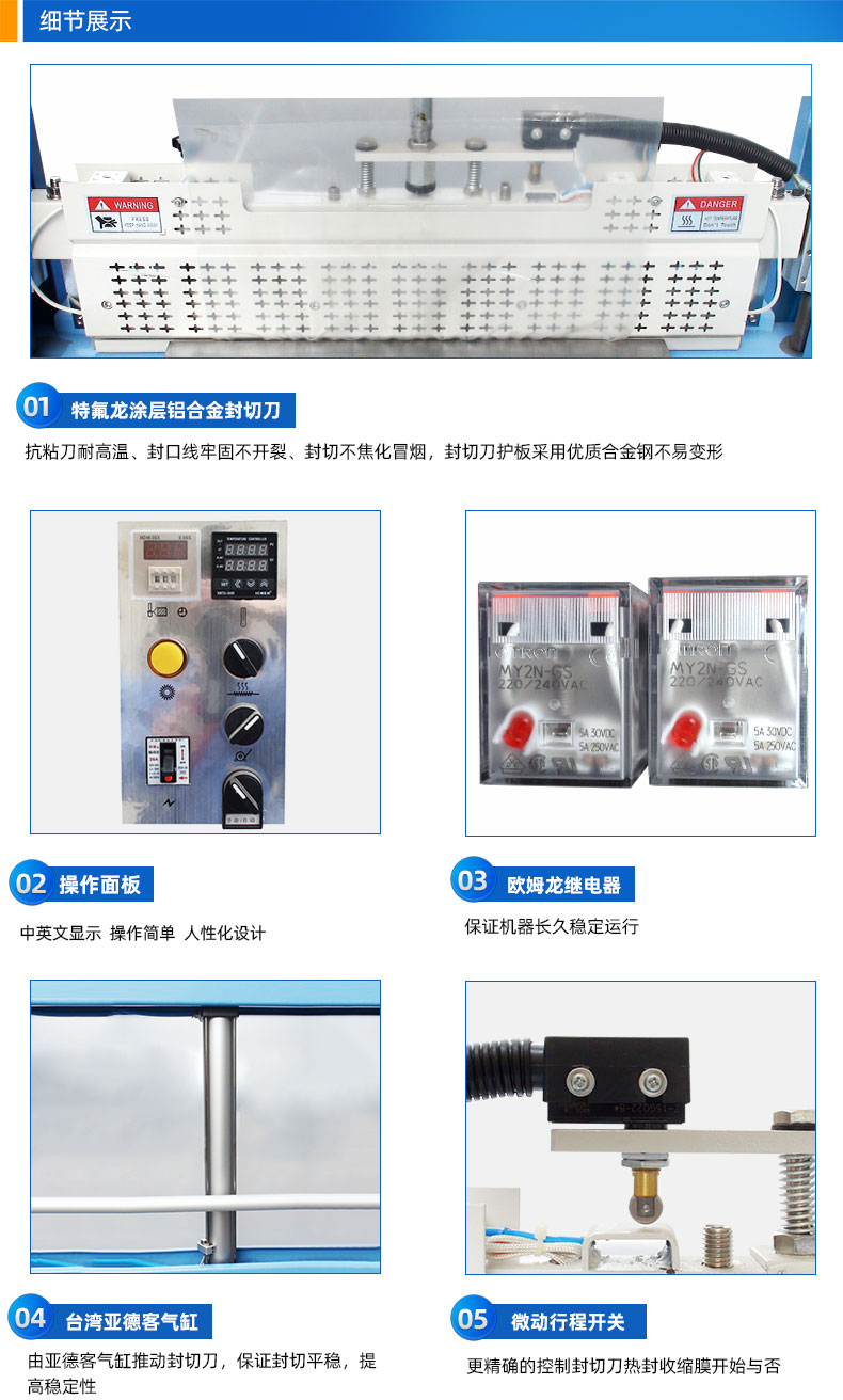 2、特氟龙涂层铝合金封切刀,抗粘刀耐高温、封口线牢固不开裂、封切不焦化冒烟,封切刀护板采用优质合金钢不易变形