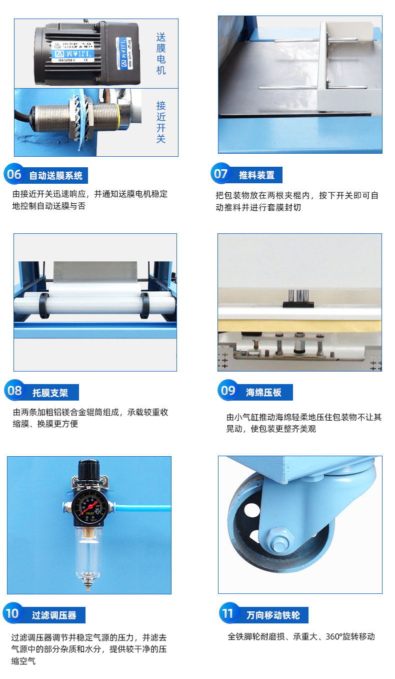 8、铝镁合金托膜支架,由两条加粗铝镁合金辊筒组成,承载较重收缩膜、换膜更方便