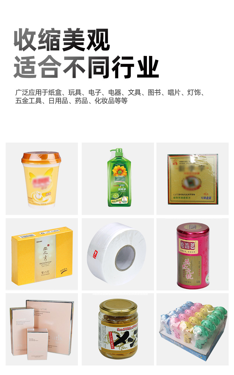 POF收缩机被广泛应用于纸盒、玩具、电子、电器、文具、图书、书籍、书本、画册、相框、相册、小黑板、唱片、洗发水、沐浴露、洗手液、五金工具、电线、日用品、饮料、纪念标签、透明胶带、医药盒、食品盒、化妆品盒、茶叶盒、手机盒、手机电池盒、移动电源盒、数据线盒、MP3/MP4纸盒、平板电脑盒、饭盒、盒饭、快餐盒、挂面、面条、桶面、盘纸、卷纸、蔬菜、口罩等商品的热收缩包装。