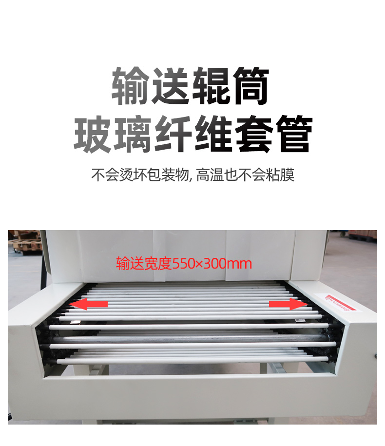 4、输送辊筒采用玻璃纤维套管,不会烫坏包装物,高温也不会出现粘膜、套管变形现象