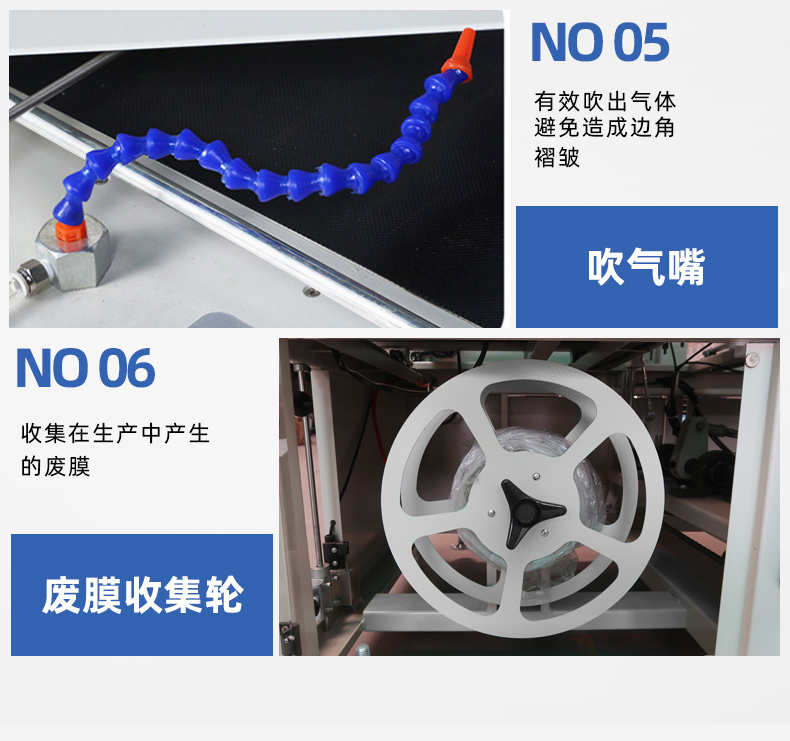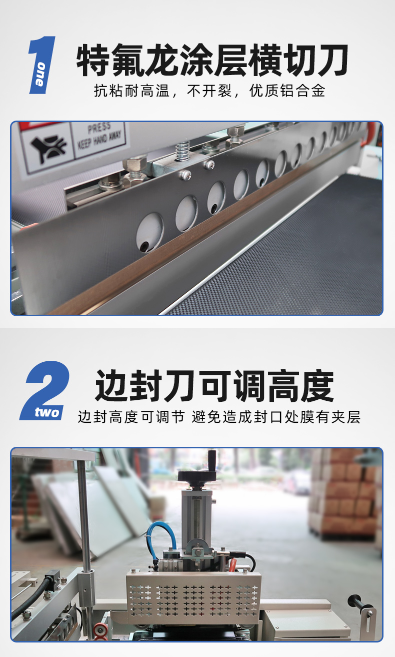2、特氟龙涂层铝合金封切刀,抗粘刀耐高温、封口线牢固不开裂、封切不焦化冒烟,封切刀护板采用优质合金钢不易变形