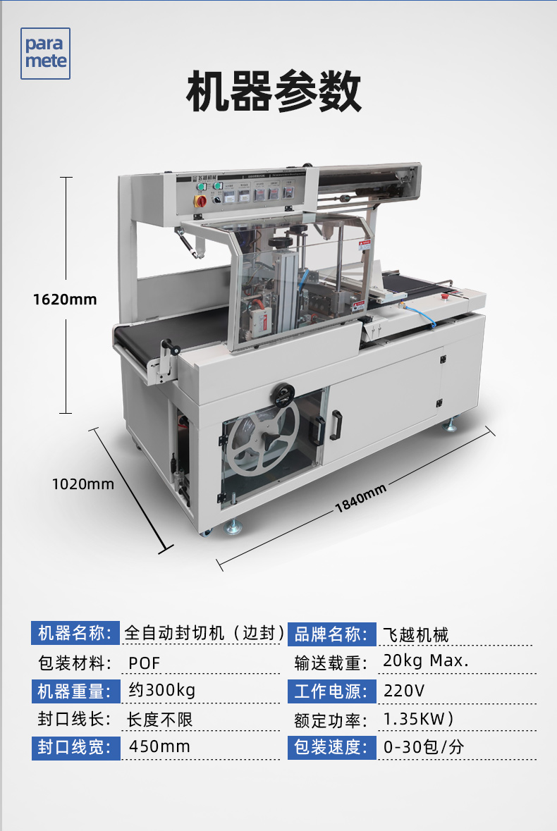 注:封口线长宽不等于包装尺寸;速度与产品尺寸有关;人工测量存在误差;重量和尺寸仅供参考,以实际为准;封切机可根据小商品定制密接;边封机常规高度为150mm,可定制加高250mm。本套机器不带空压机,需另行选购!