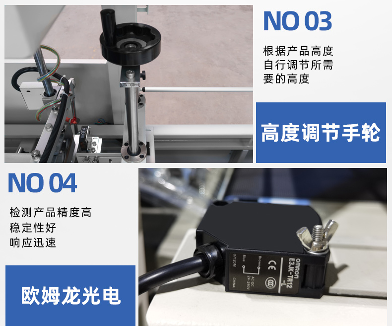 9、包装物尺寸变更时,只需调节高度和宽度,不用更换模具与制袋器;还可根据商品高度通过手柄单独调节纵封和横封的封切线使之位于商品的中线位置