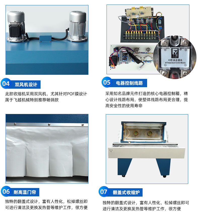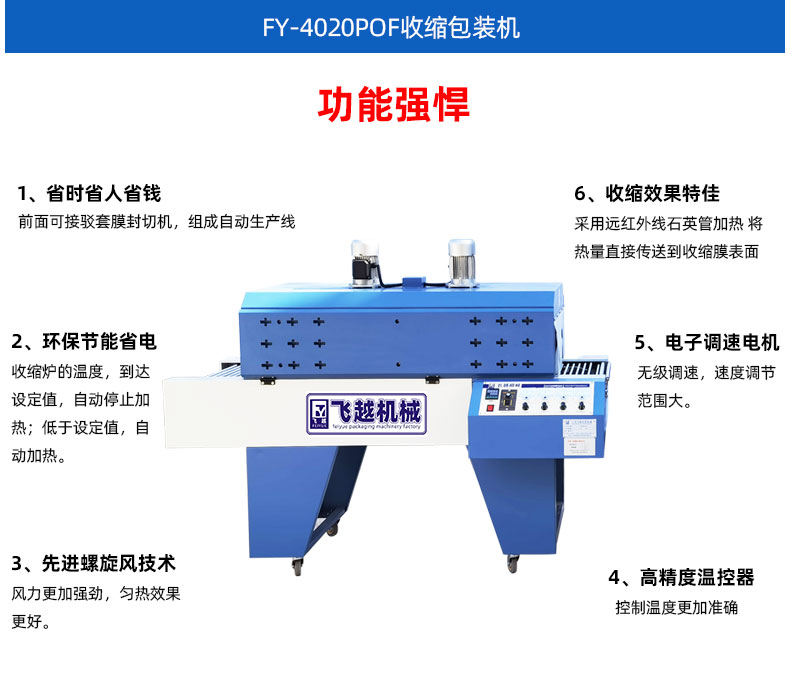 POF收缩机,属于热收缩包装机的一种,以POF收缩膜为包装材料,根据POF特性而设计研发的双风机机型,收缩PVC膜也很好,通过螺旋风技术将远红外线加热管产生的热量用强劲的风力使其均匀散布于整个发热仓内并传送到收缩膜表面,以使收缩膜达到所需的温度而产生热收缩反应迅速定型,外套玻璃纤维套管的辊筒也会随着输送链条的运行而匀速、不间断的滚动,保证商品底部不会出现局部温度过高及粘膜,解决底部难收缩的困扰,从而使商品各面收缩良好。