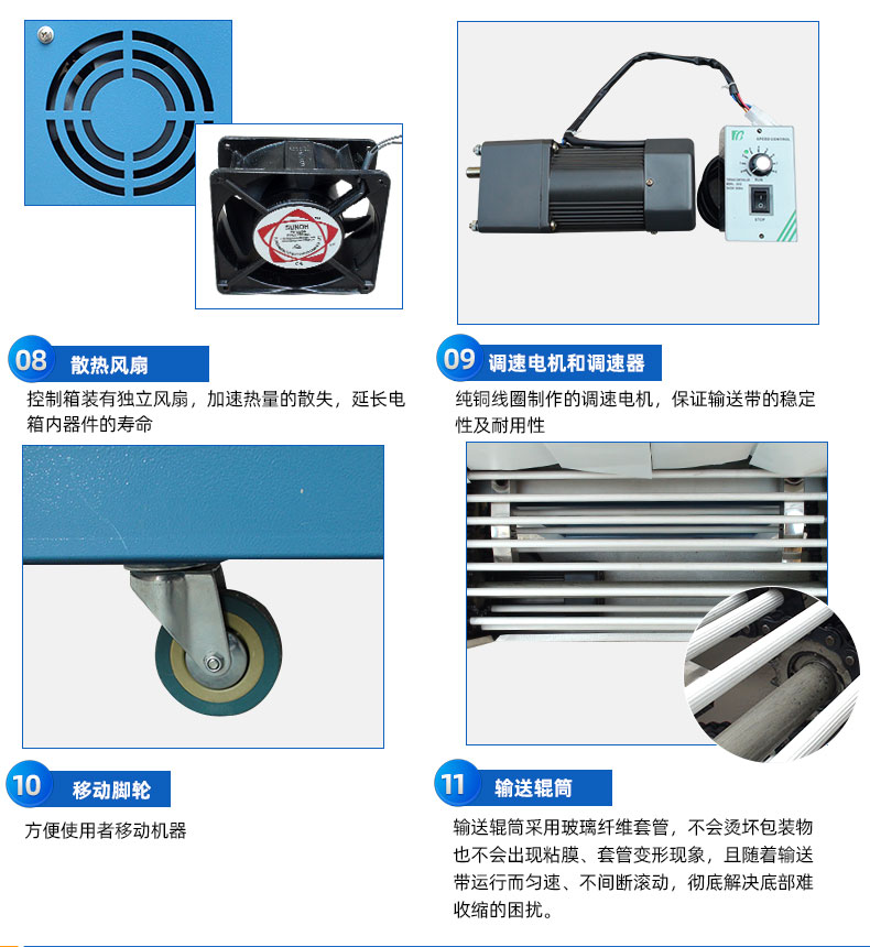 4、输送辊筒采用玻璃纤维套管,不会烫坏包装物,高温也不会出现粘膜、套管变形现象