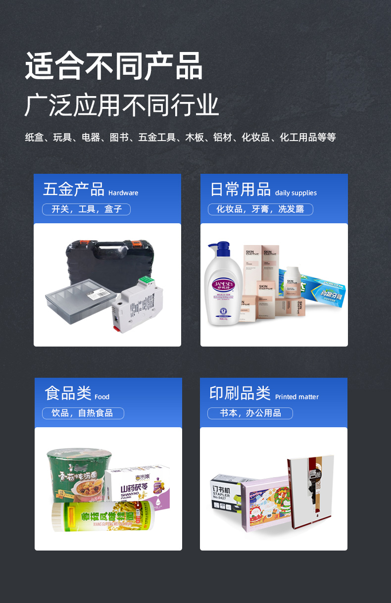 广泛应用于纸盒、玩具、电子、电器、文具、图书、唱片、五金工具、地板、木板、建材、铝材、日用品、药品、饮料、化妆品、化工用品、工艺品、标签等商品的热收缩包装。