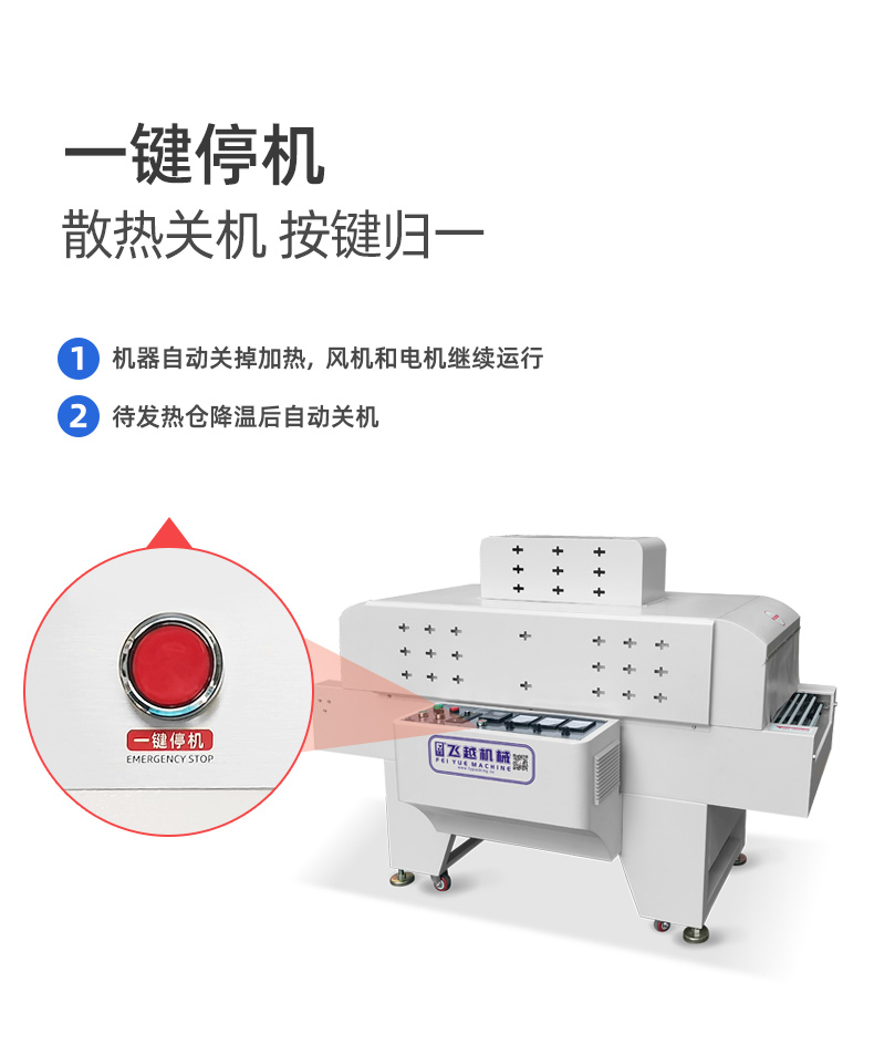 1、一键停机功能,让机器自动关掉加热,风机和电机继续运行,待发热仓降温后自动关机