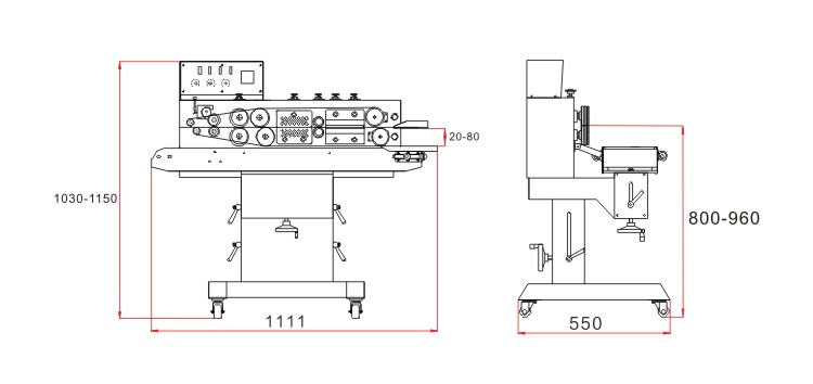 3、当装有产品的复合袋放在输送带上,且袋子的封口部分放在两条封口带之间,在上下两条封口带的夹持和输送带的配合下自动送入加热区,封口带在加热区受到两加热块的挤压,同时加热块的热量通过封口带传输到复合袋的封口部位从而使复合袋受热熔软后粘合,然后,在封口带夹持下送入冷却区,使薄膜表面温度适当下降,然后经过滚花轮(或印字轮)滚压使复合袋的封口部分滚压出条纹状或网状(或通过印字轮压印出所需的文字),此款为固体墨轮,所以封印花轮封口后输送到固体墨轮印出黑色字体,可用来打印简单的黑色日期字体,最后由导向橡胶带与输送带配合将封口印码的复合袋送出连续封口机外面。