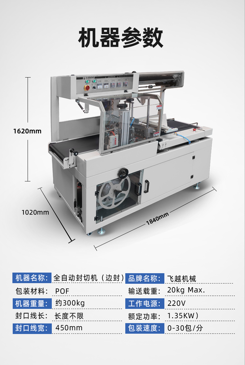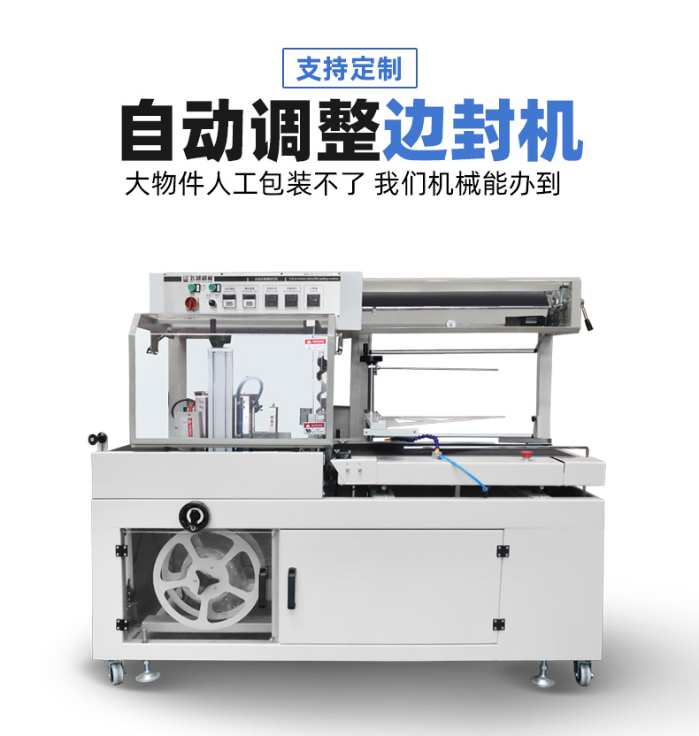 全自动封切机(边封),以POF热收缩膜为包装材料,对商品进行自动套膜封切并输送到收缩机进行热收缩包装以使商品收缩良好。封切机根据自动化程度分为全自动和半自动,需后接POF收缩包装机组成全自动或半自动生产线,代替人工套膜提高生产效率,尤其是全自动封切机与自动生产线配合使用更能体现其优越性。