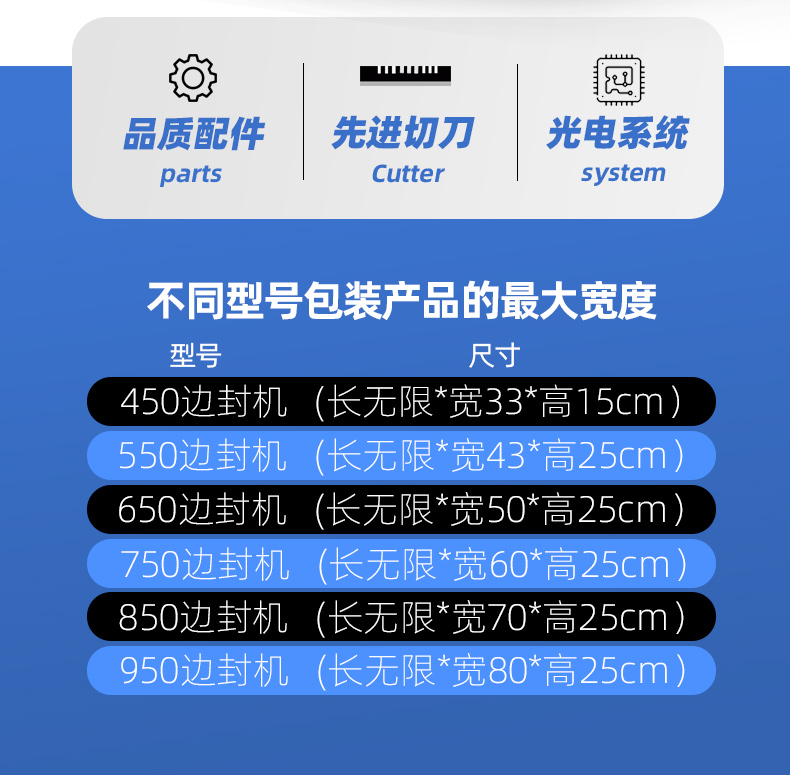 注:封口线长宽不等于包装尺寸;速度与产品尺寸有关;人工测量存在误差;重量和尺寸仅供参考,以实际为准;封切机可根据小商品定制密接;边封机常规高度为150mm,可定制加高250mm。本套机器不带空压机,需另行选购!