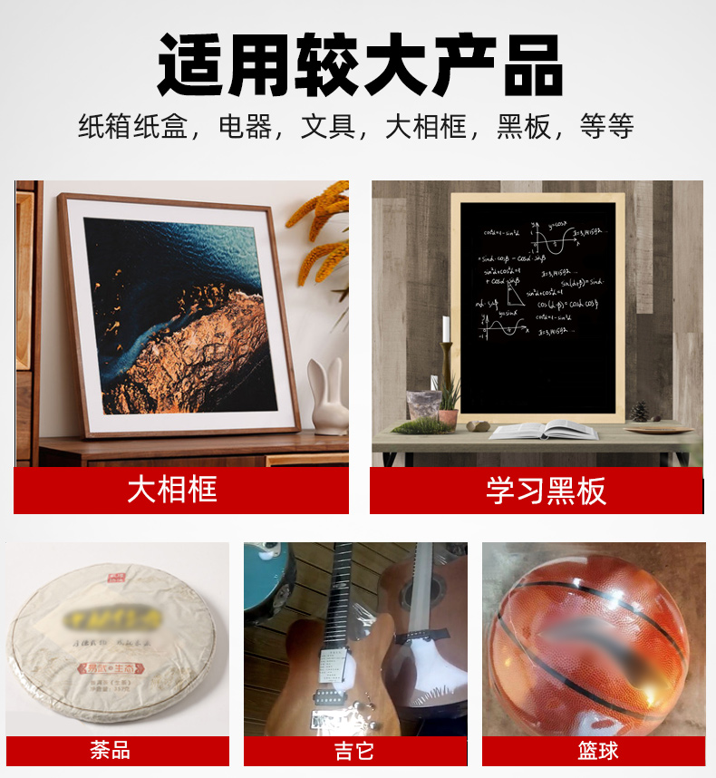 广泛应用于纸盒、玩具、电子、电器、文具、图书、唱片、五金工具、地板、木板、建材、铝材、日用品、药品、饮料、化妆品、化工用品、工艺品、标签等商品的热收缩包装。