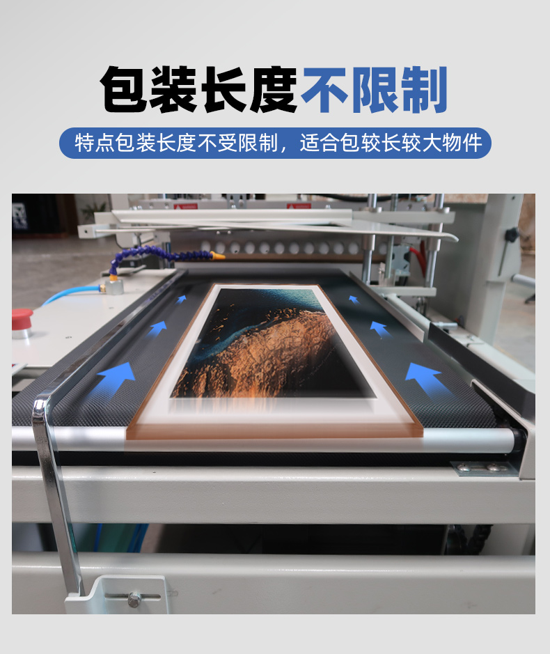 7、自动送料装置,把包装物放到输送带,机器自动送料进行套膜封切,然后输送到收缩机