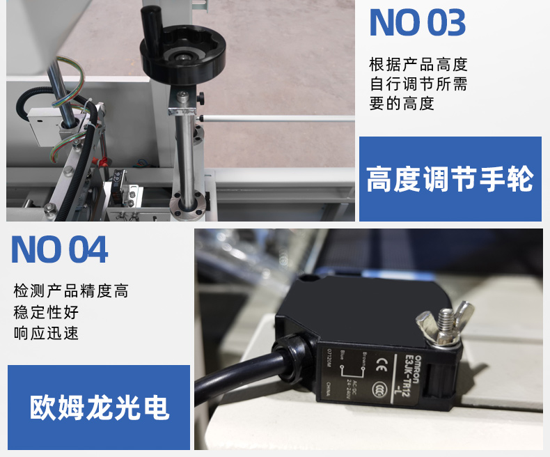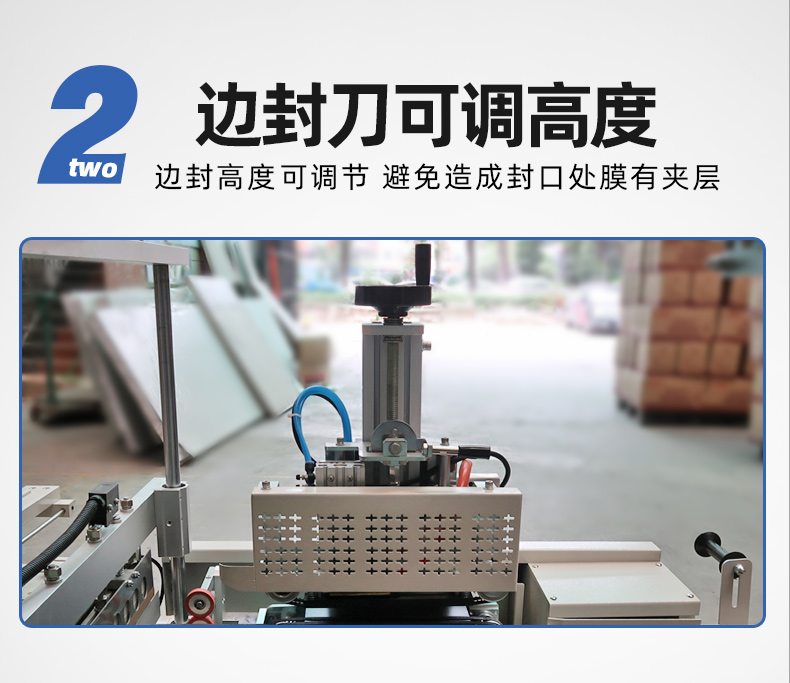 9、包装物尺寸变更时,只需调节高度和宽度,不用更换模具与制袋器;还可根据商品高度通过手柄单独调节纵封和横封的封切线使之位于商品的中线位置