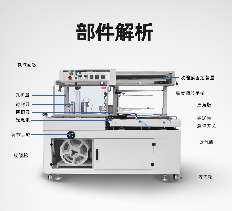 8、铝镁合金托膜支架,由两条加粗铝镁合金辊筒组成,承载较重收缩膜、换膜更方便