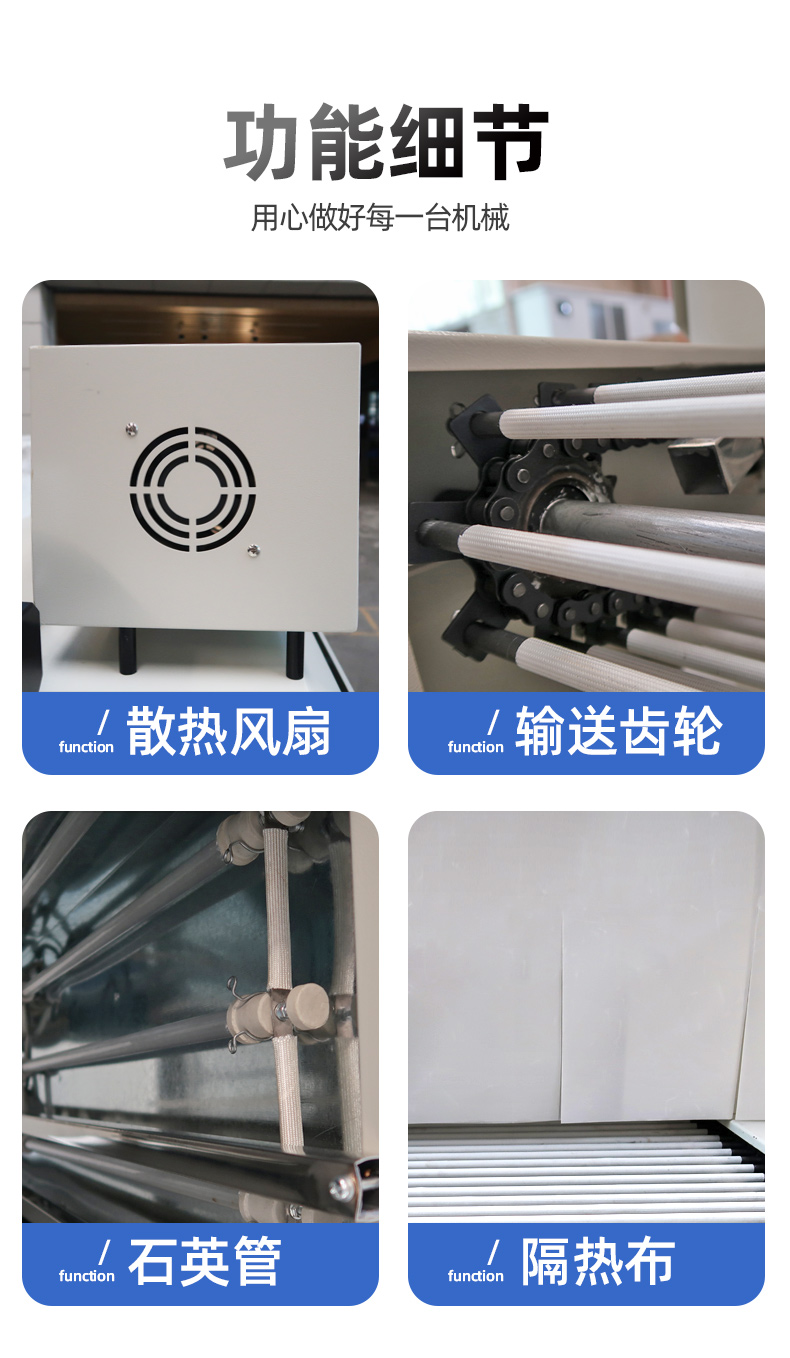 4、输送辊筒采用玻璃纤维套管,不会烫坏包装物,高温也不会出现粘膜、套管变形现象